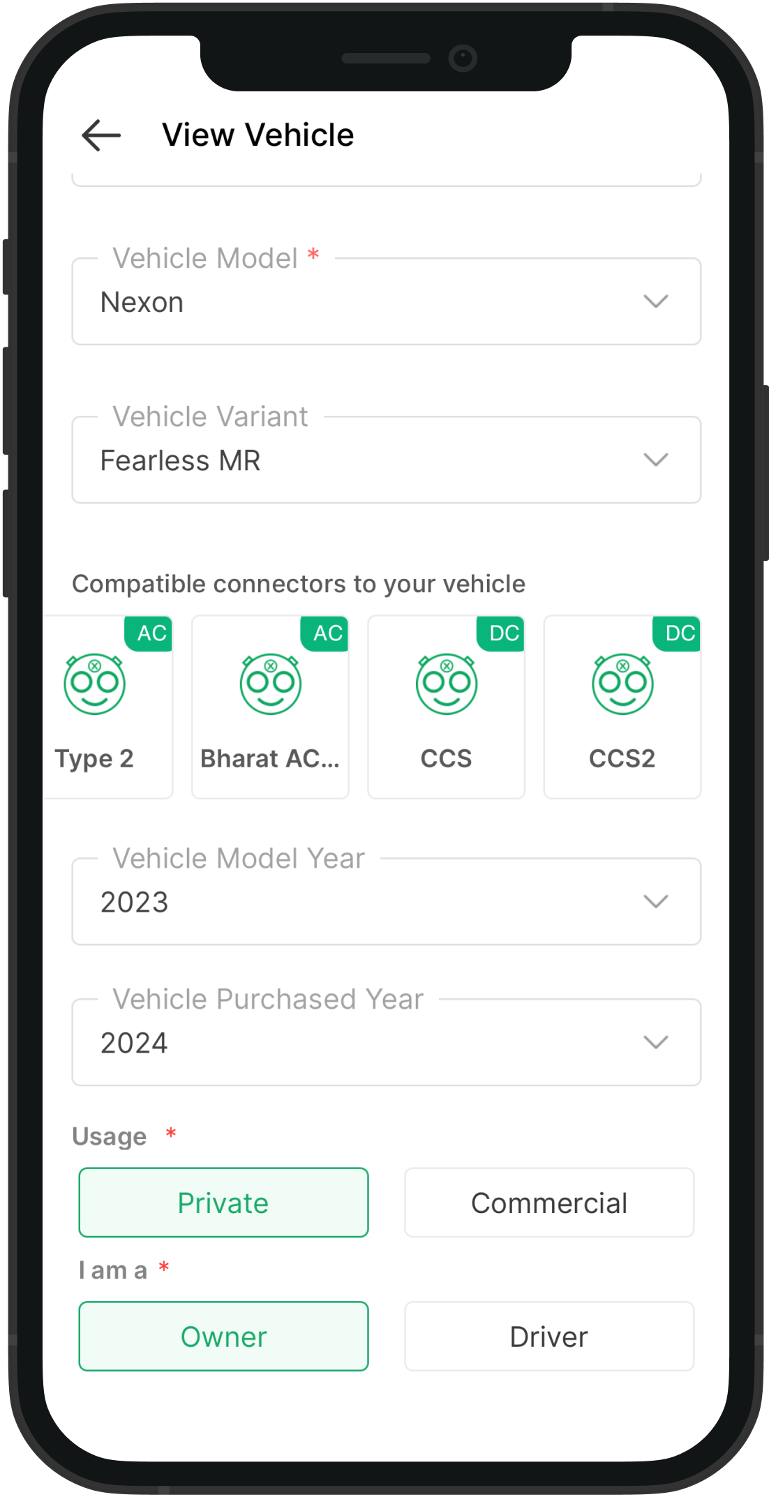 No matter what you're driving—be it an electric car, scooter, passenger 3-wheeler, cargo 3-wheeler, or even a cargo 4-wheeler—our app helps you find the right charging connector. We’ve got you covered with a comprehensive list of connectors, so you can charge up with ease wherever you go.